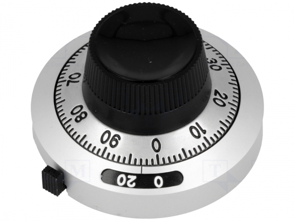 Ручка точной настройки многооборотного потенциометра, модель H-46-6A. Изготовлена из металла. Посадочное место резистора - круглый вал (крепление винтом), диаметром 6,35 мм. Цвет серебристый. Имеет механический счетчик и черный указатель.