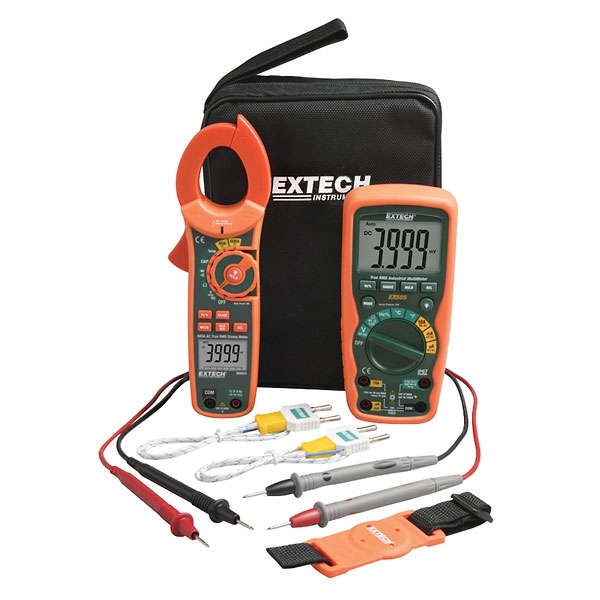 Измеррительный набор, состоящий из токоизмерительных клещей MA620, мультиметра EX505 и сопутствующих аксессуаров в удобном чехле.